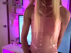 Tranny with big tits tugs on her big cock